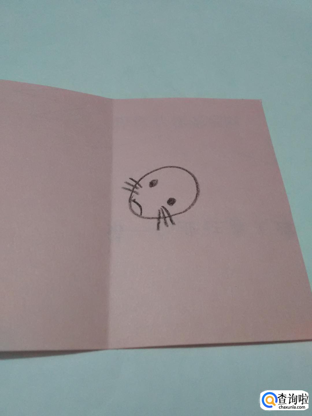 在椭圆形左下方画一条弧线,表示老鼠的嘴,在嘴的右侧,画六条斜线,表示老鼠的胡须,在胡须右侧画两个椭圆形的黑点,表示眼睛。