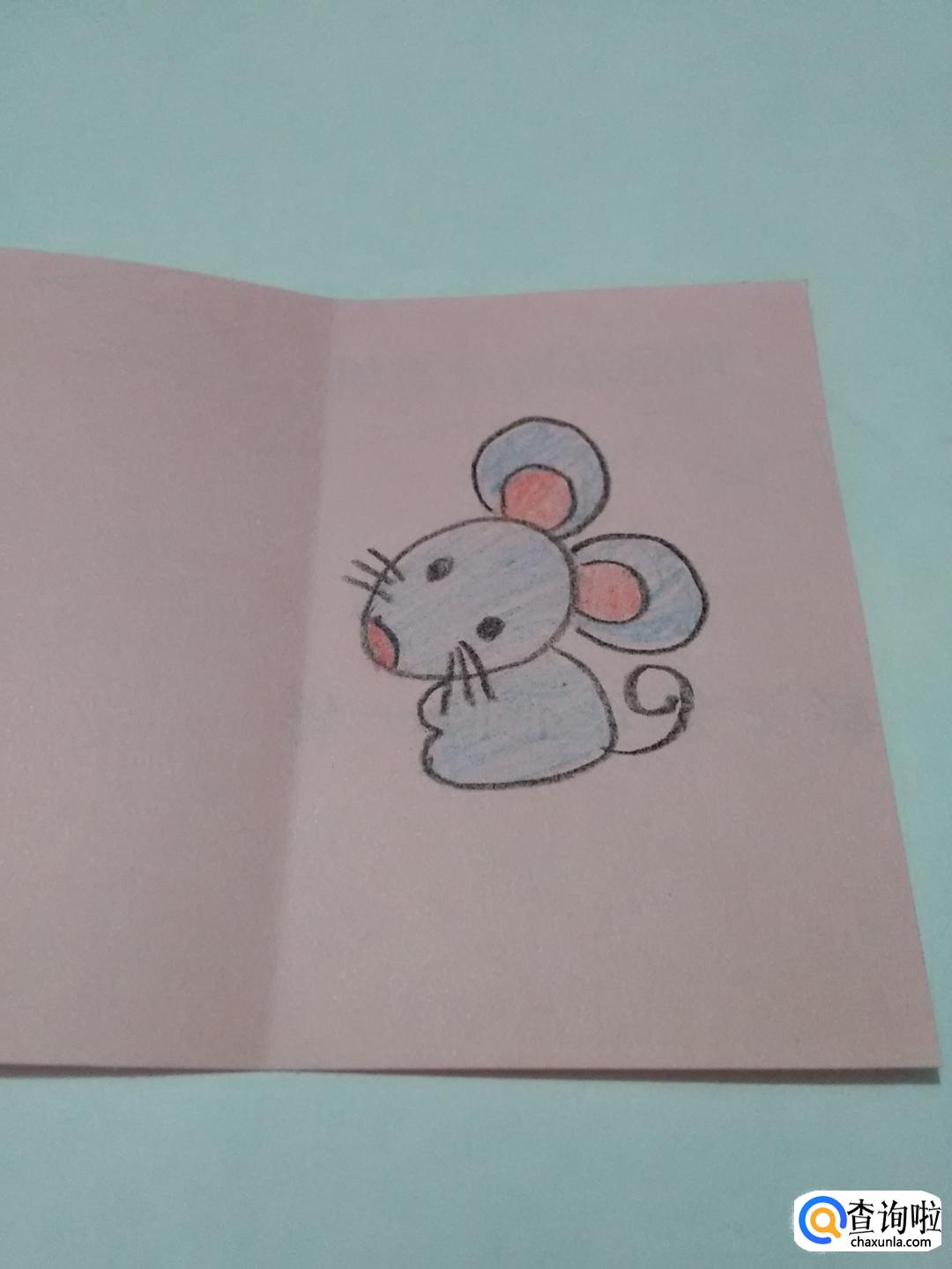 做新年贺卡,要在彩纸右半边画出新年生肖的卡通画,在彩纸左半边写上新年快乐几个字,下面就来做鼠年的新年贺卡。