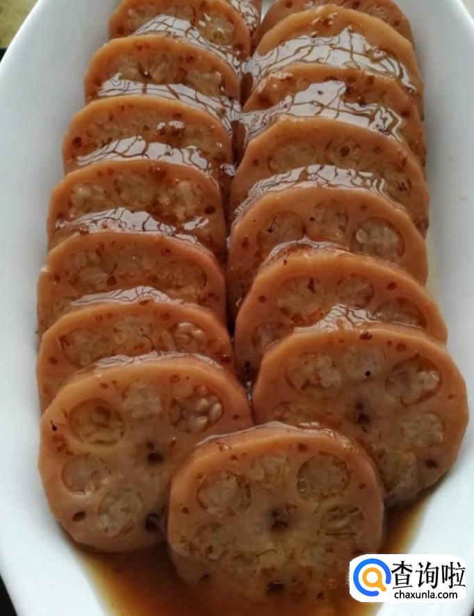 炖好以后我们把它取出来,用刀切成厚片,摆入盘中,浇上煮藕的汤汁