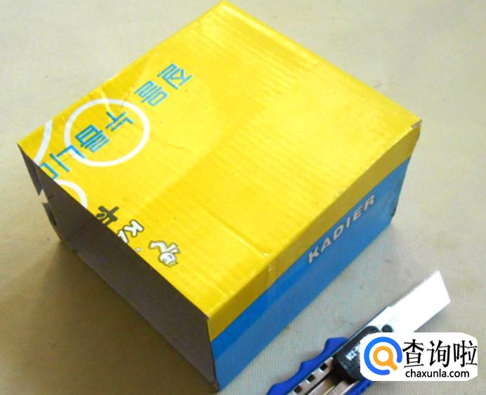 再找一个略大一些的纸盒,同样用剪刀把一端的盒盖剪掉: