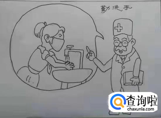 出门回到家,或者触碰过其他物体之后,一定要第一时间用肥皂或者洗手液等彻底洗手,可以画一个医生,再画一个洗手的场景。