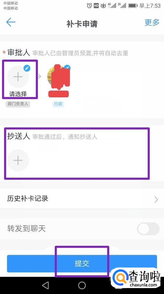 弹出的界面,我们填写补卡时间点,缺卡原因,如果有图片的话,就上传图片,点击选择审批人,如果有抄送的人的话,就选择抄送的人,最后点击提交;