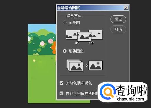 点选:难叠图像;再勾选:无缝色调和颜色、内容识别填充透明区域;如上图所示。然后点确定。那么,这两张图片即融为一体啦。