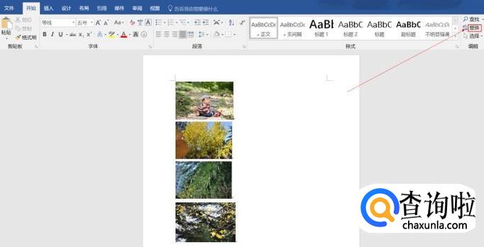 打开Word,在设置之前,所有图片都是靠左。点击“替换”,弹出替换对话框。