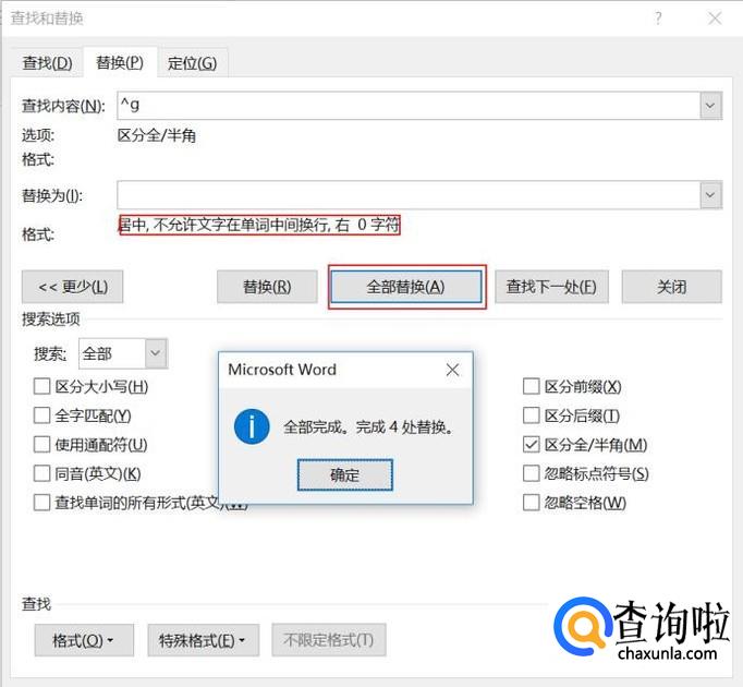 单击“全部替换”,即可看到替换4处。