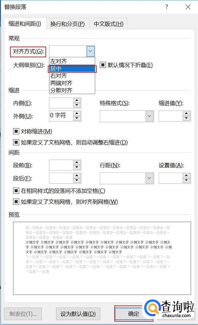 在替换段落对话框中选择对齐方式为“居中”,然后点击“确定”。