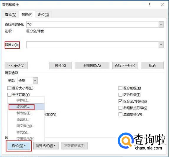 选中“替换为”对应小方框,单击“格式”--“段落”,弹出替换段落对话框。