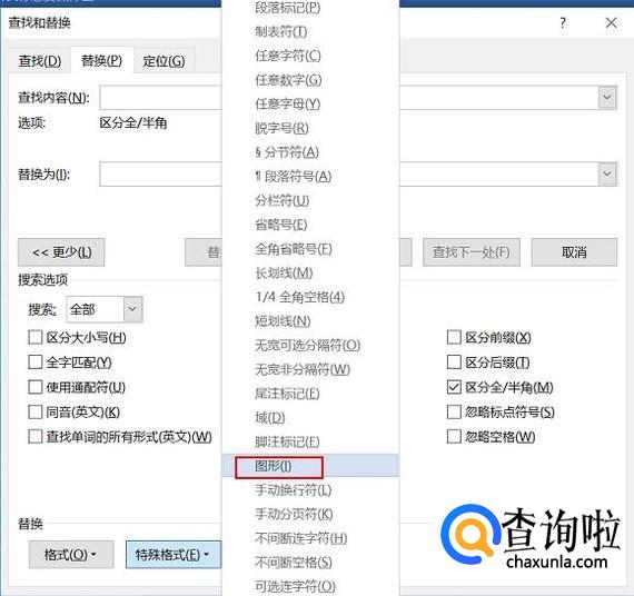 选中“查找内容”小方框,单击“特殊格式”--“图形”,