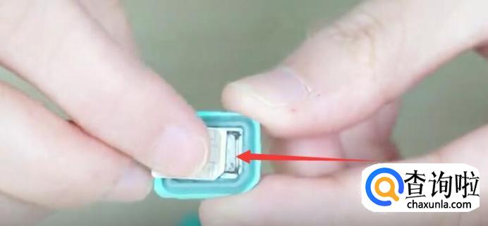 然后把电话卡芯片的一面朝上,对准缺口,把卡放进卡盖的凹槽内。