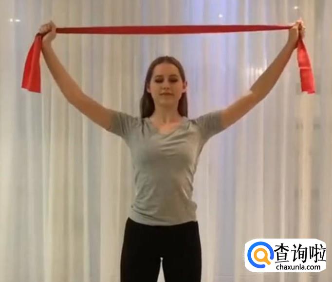 双脚呈八字形站立,双手抓住弹性布条在头顶上方,进行拉伸布条训练。