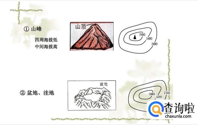 山顶(山峰):等高线地形图中,数值中部高四周低,则中部为山顶。盆地或洼地:等高线地形图中,数值中部低四周高,则中部为盆地。