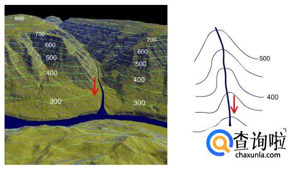 山谷:等高线由低处向高处弯曲的地方,就是山谷。山谷是集水线(集水区),水源能汇聚在一起,所以这里一般会形成河流 。