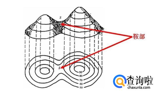 鞍部:正对的两山脊或山谷等高线之间的空白部分,(相邻两个山顶之间的低下部分,外形像马鞍而得名。)也是山脊上两山间的低浅处,但略比山坳为高,如鞍部地形狭窄而深下,用来作横跨山脊两侧的道路,则称做山隘。