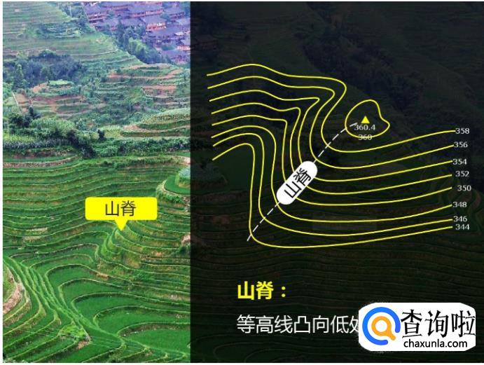 山脊:等高线由高处向低处弯曲的地方就是山脊。山脊地势比两侧高,是分水线,所以往往是河流的分水岭。