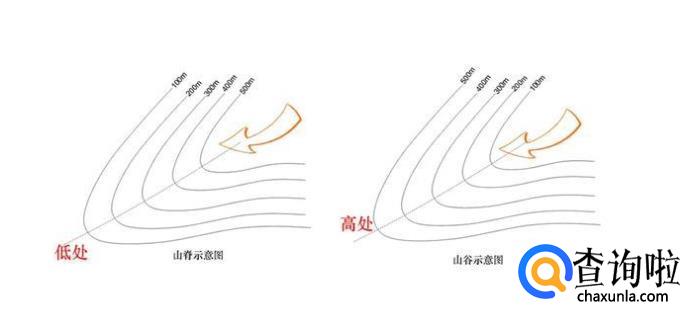 山谷和山脊的判别:等高线向海拔较高处凸出的是山谷,向海拔较低处凸出的是山脊,因此“凸高为谷,凸低为脊”
