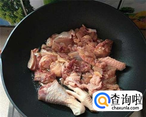 鸡肉清洗干净,热锅下油,放入姜蒜煸香,然后再放入鸡肉,加入少许酱油,翻炒变颜色。