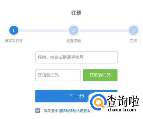 第一步是填写手机号,然后点击“获取验证码”,再把发送到你的手机的验证码输入,点“下一步”。
