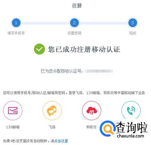 接着就会显示注册成功,为你飞配一个移动认证号。