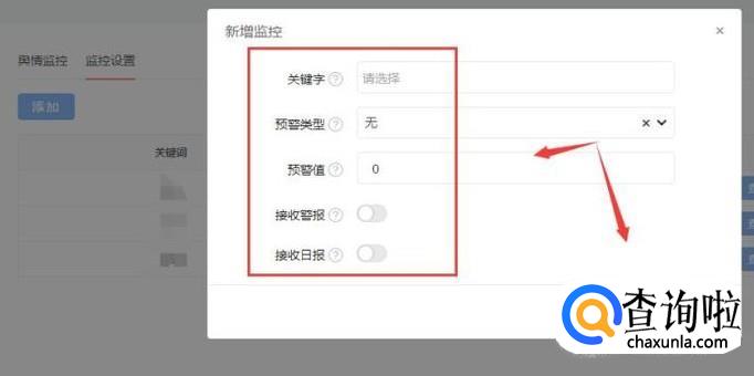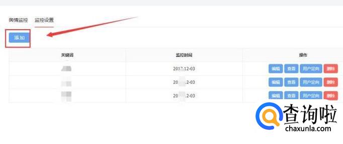 如下点击的是“监控设置”选项卡打开如下窗口,在此窗口下方点击左侧的“添加”按钮,进行添加关键词进行监控操作。