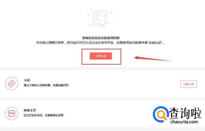 如下点击的是“卡券”选项卡,打开如下窗口,再按照窗口提示点击页面上的“立即认证”按钮进行下一步的认证窗口中。