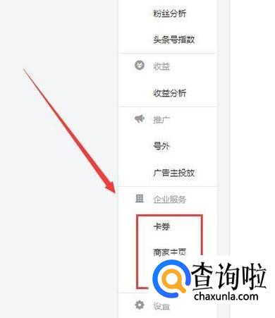 打开并登陆企业头条号,登陆成功后在左侧会看到有:企业服务,下方有:卡券、商家主页、舆情监控,三个选项卡。