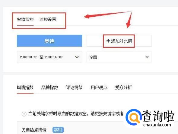 如下点击的是“舆情监控”选项卡,打开如下窗口;可以直接点击窗口右侧的“添加对比词”按钮,可以点击它进行添加操作。