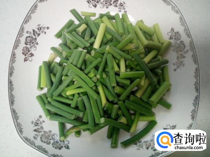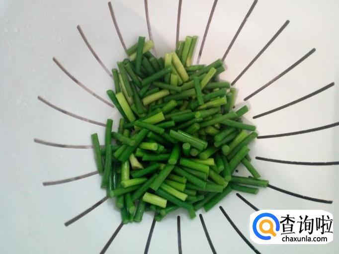 蒜薹收拾清洗干净,控干水分,切成寸段。