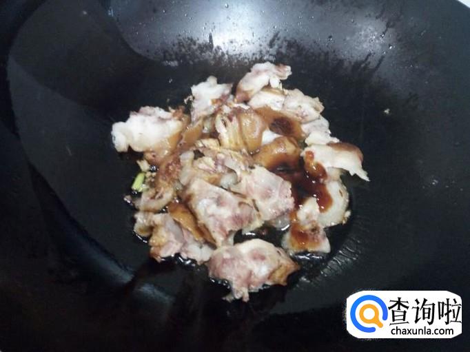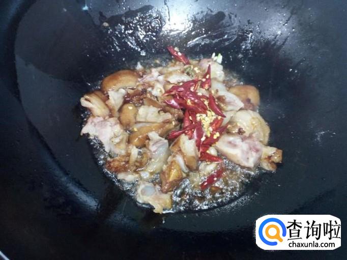 锅内放入油加热,油热后放入花椒,葱,姜,爆锅。放入猪蹄肉小火翻炒,放入料酒,蚝油,少许酱油。