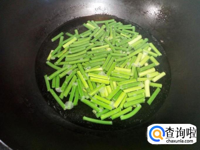 蒜薹用开水焯一下,水开后入锅20秒钟捞出,迅速用冷水过凉,沥干水分。
