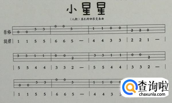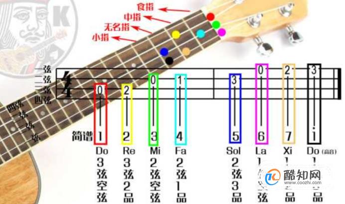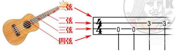 琴上的品格与四线谱上的数字的对应关系如下图所示。四线谱上哪条线上写了数字就代表右手该弹哪根弦,数字是几就代表左手按第几品(当然是左手先按好右手再拨弦),前两个0就代表三弦空弦(空弦的意思就是直接拨响,左手不用按品),后两个3就代表左手按住2弦3品。