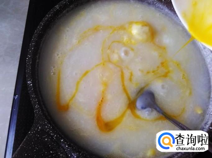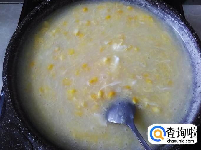 最后倒鸡蛋液进去,也是一边倒一边搅拌,倒完后就可以熄火了,美味的鸡蛋玉米羹就做好了。