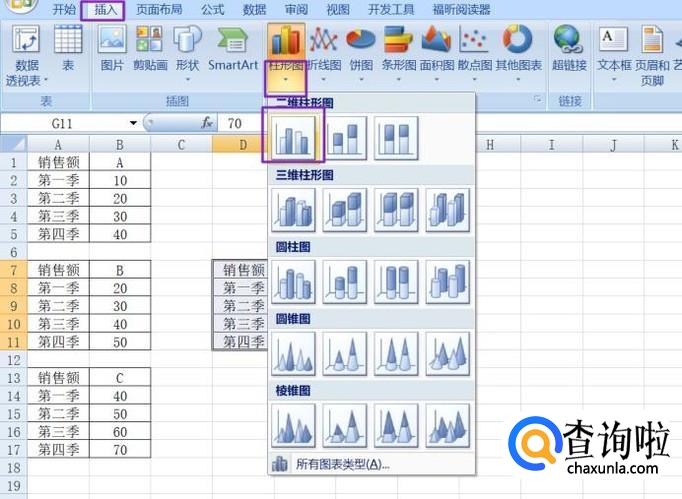 点击工具栏中的插入,点击柱形图的下拉箭头,然后选择二维柱形图;