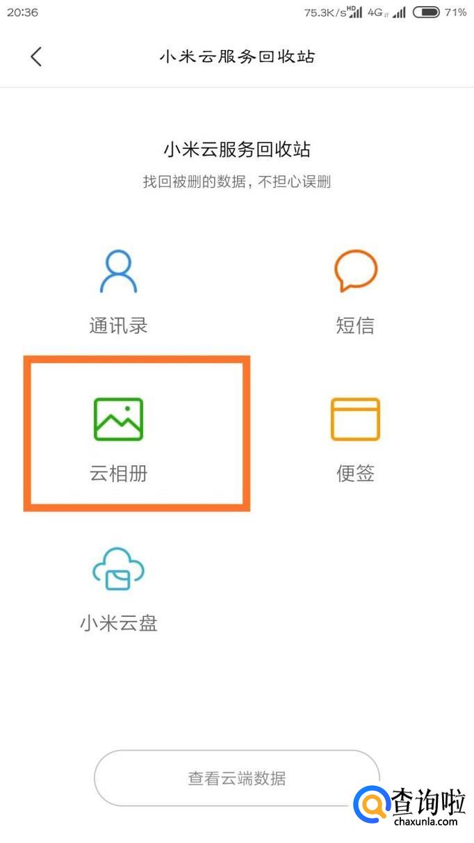 然后这里就是小米云服务回收站了,点击“云相册”,注意不是查看云端数据,云端数据是备份了的所有照片,有点多。