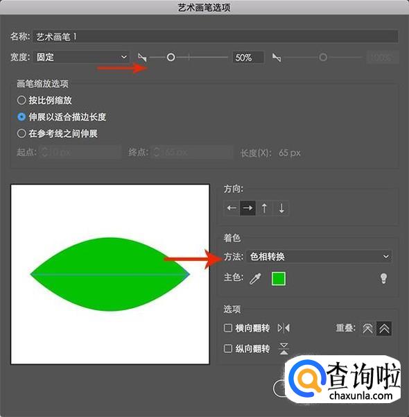 进入艺术画笔选项界面,将宽度调整为50%,然后将着色方法调整为色相转换,这样我们就设置好画笔了。