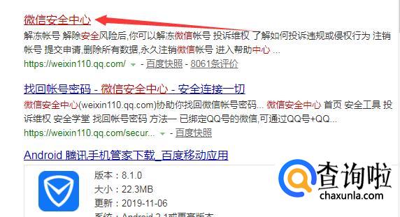 首先,我们先使用网络搜索引擎搜索“微信安全中心”。