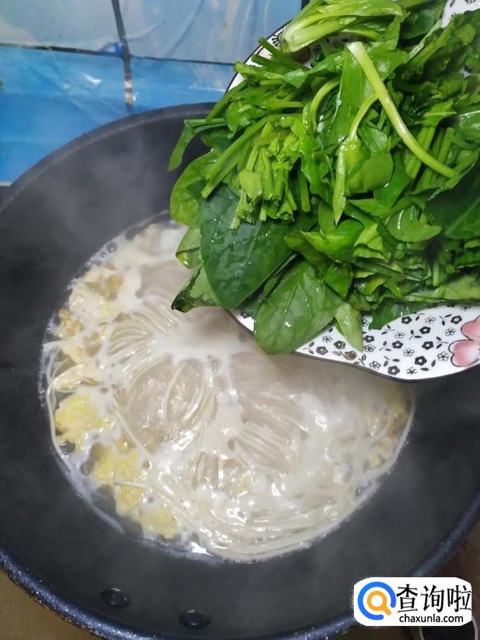 将之前准备好的菠菜,倒入锅中一起煮一下。