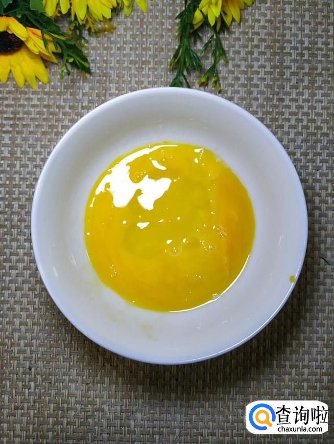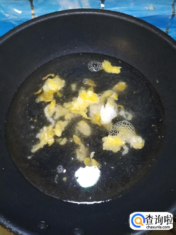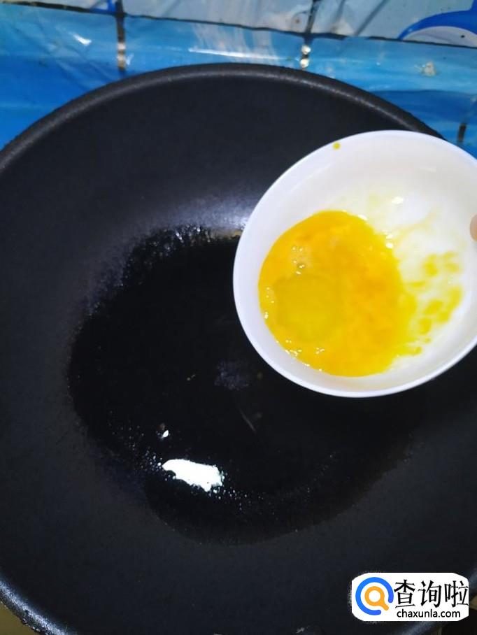 碗中打入一个鸡蛋,加入适量食盐,打散。然后炒锅中放入适量油,将鸡蛋倒入锅中炒熟。