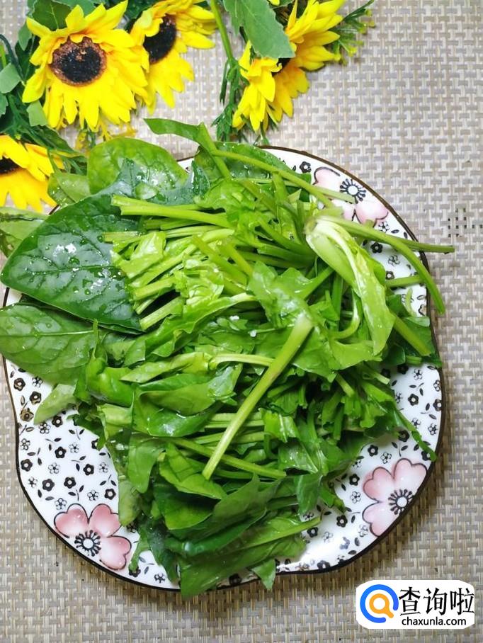 准备适量菠菜,去除根部,洗去泥沙,切成段,放入盘中备用。