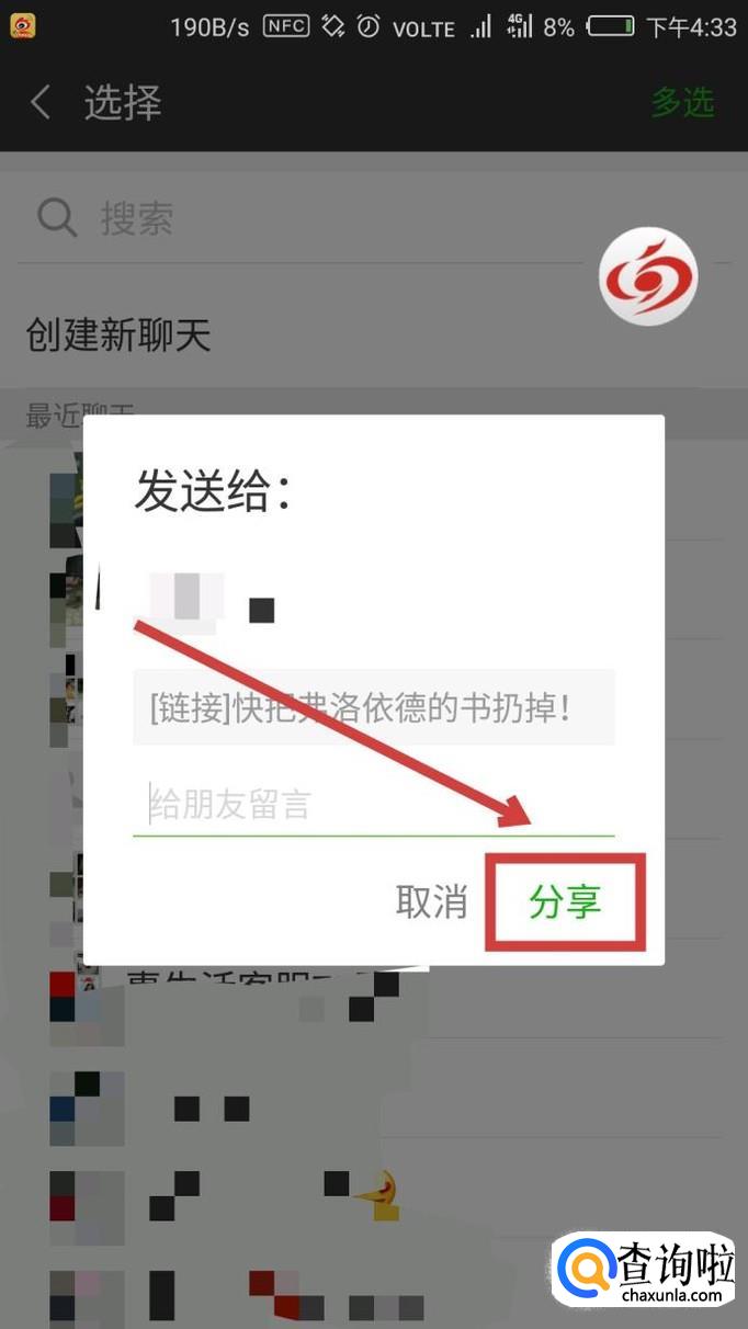 然后微信就会弹出来,选择你想要转发的好友,并点击【分享】即可。