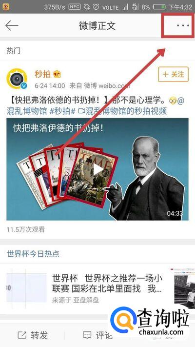 首先,在微博中找到这个视频,点击右上角的三个点,如图所示。