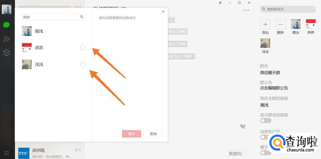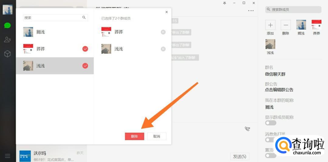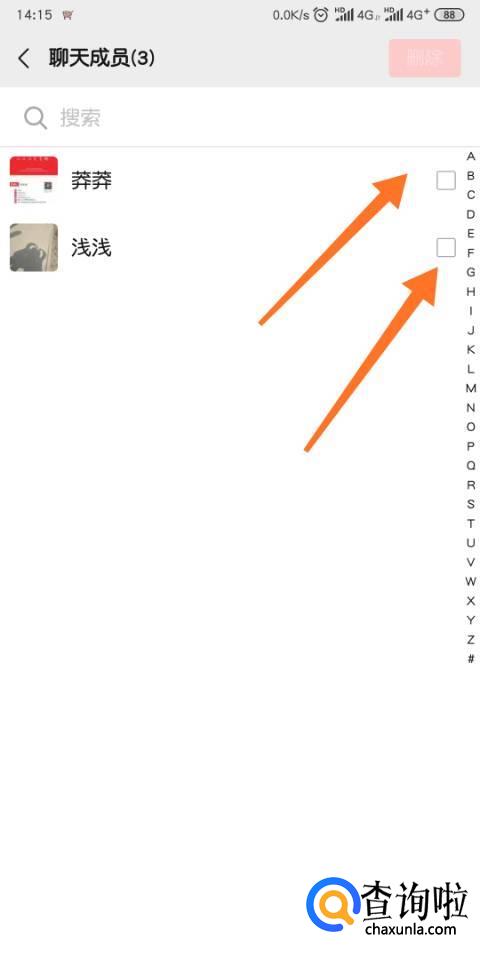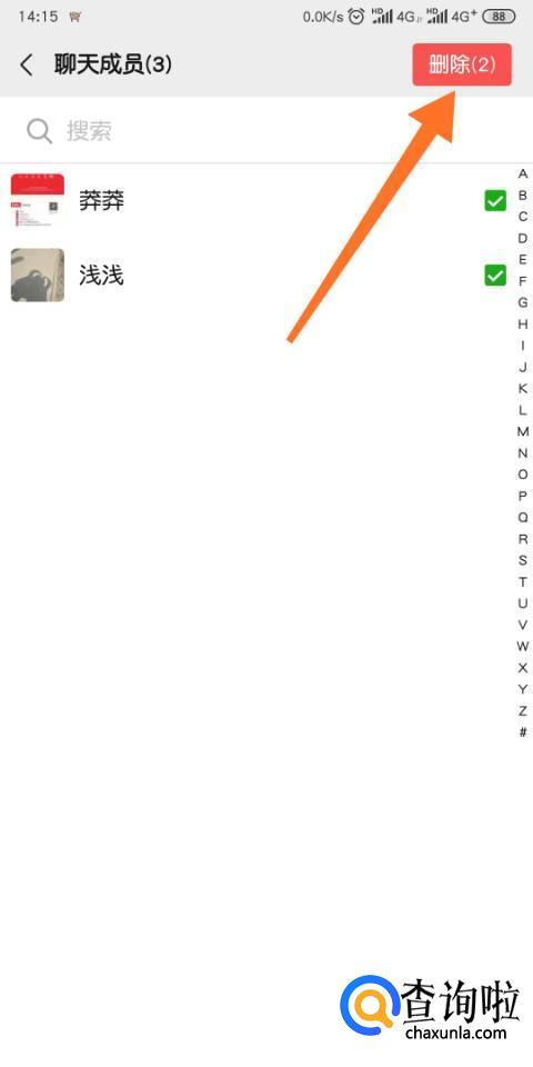 选中后小方框会呈绿色,这是我们再点击右上方的“删除”键,这时一定要选中所有的群成员。