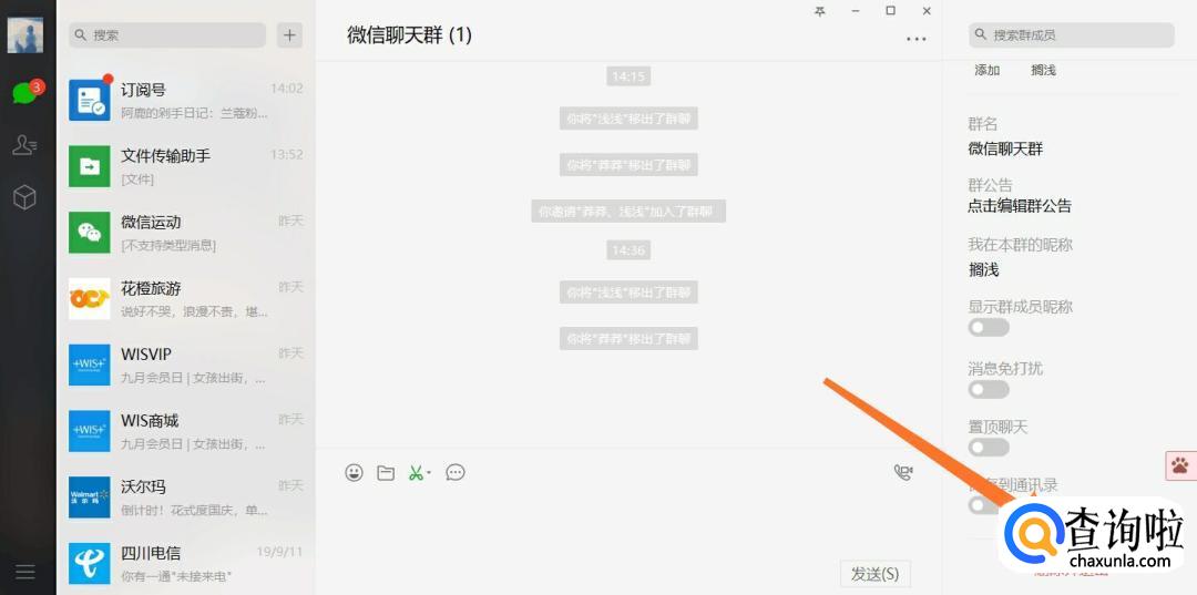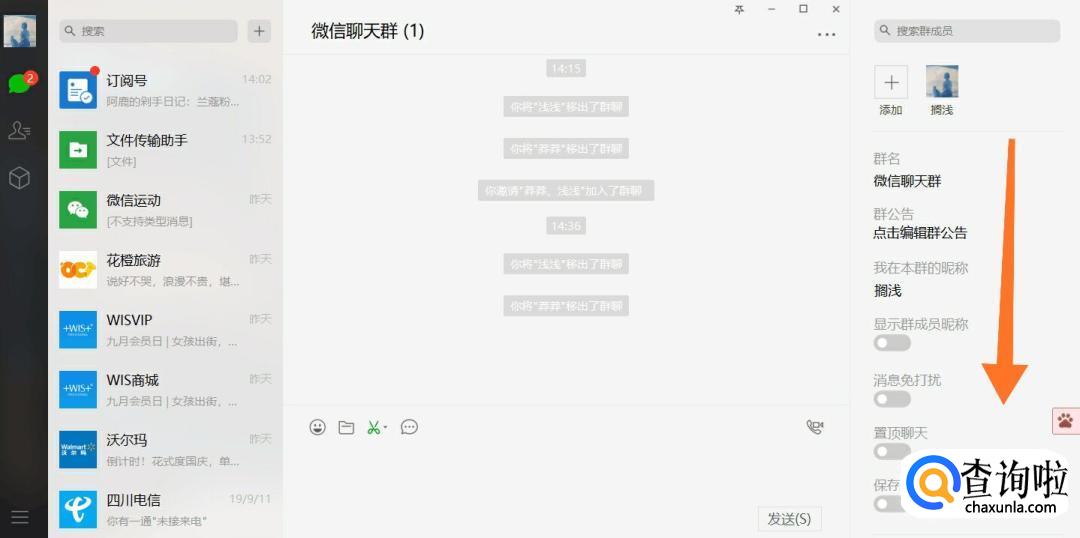 这时群里面只有自己一个人了,这时将鼠标指向箭头方向向下滑动直至低端。