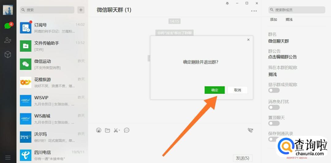 这时再点击绿色方框中的字“确定”, 然后我们就成功地解散微信群了。