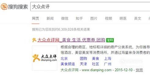 打开搜狗浏览器,在搜索框输入“大众点评”,点击带有“官网”的链接进入。