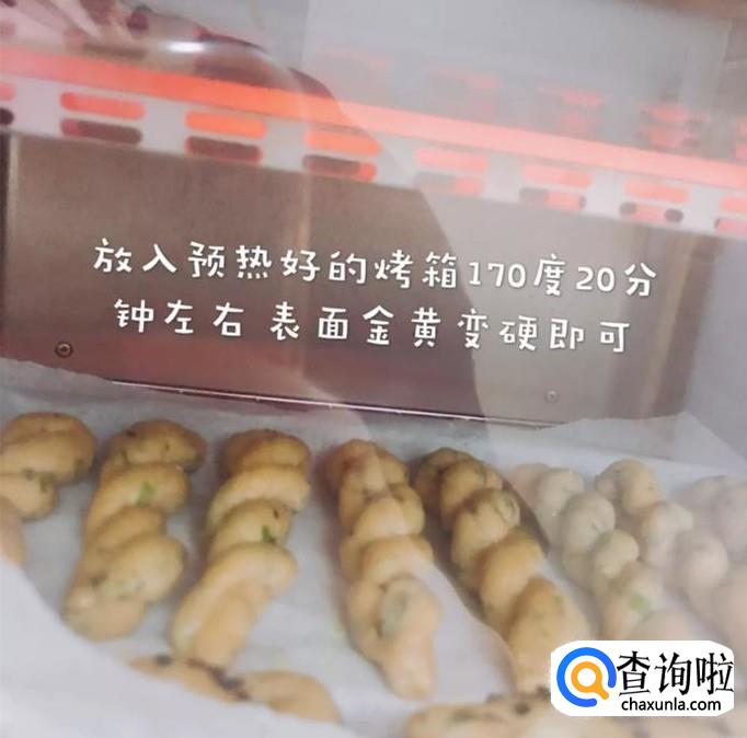 然后烤箱提前预热五分钟,把麻花放到烤箱170°火烤20分钟,如下图所示。