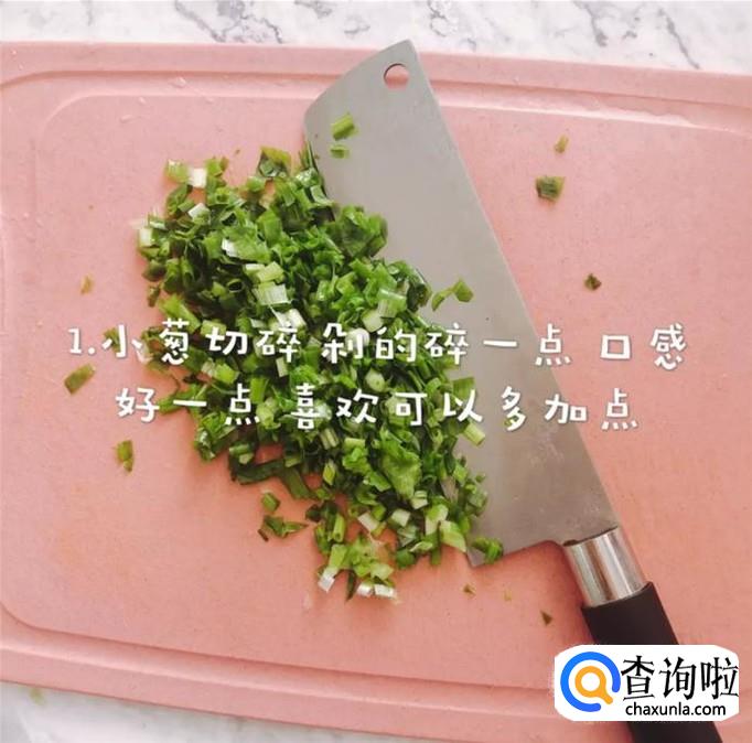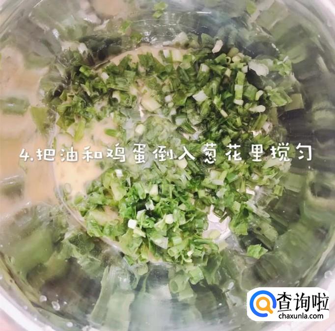然后把油和鸡蛋倒入葱花里搅拌均匀,如下图所示。