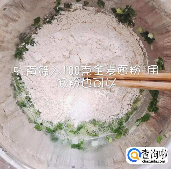 接着筛入100克全麦面粉搅拌均匀,如下图所示。