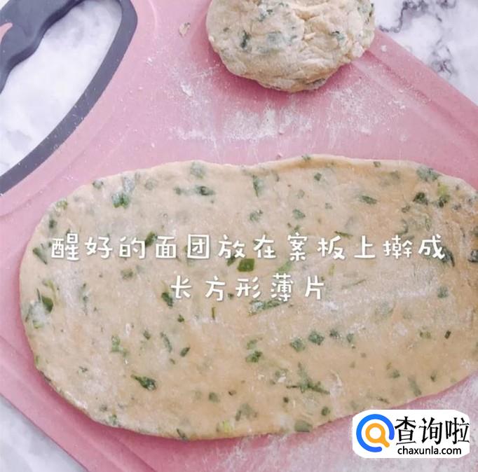接着把醒发好的面团放在案板上,用擀面杖擀成长方形的薄片,如下图所示。