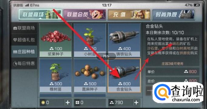 先去拱廊街,购买合金钻头,如图所示,有几率出硝石。