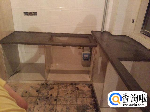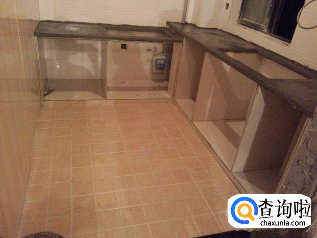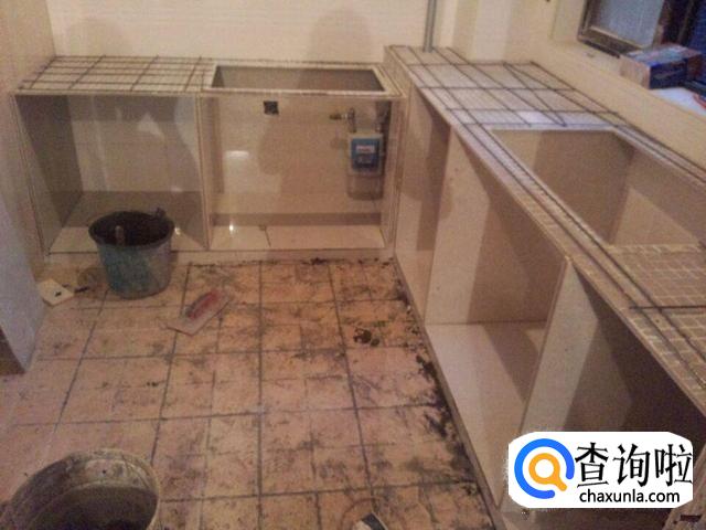 首先用水泥砖铺底,灶台的总高度的可以根据主人的身高而定,一般来说在80公分左右,台面的宽度60公分,建议用水泥砖铺3层左右。然后算站立瓷砖(什么是站立瓷砖:就是用两块瓷砖背对背用结构胶黏起来,中间两边各夹一块变成三块重叠的边)和铺盖瓷砖的数量。站立瓷砖的宽度记得要减掉人造石台面的边挂厚度(1.5厘米)与柜门(1.5厘米)和2厘米的厚度。这个规格要用切割机切割好。